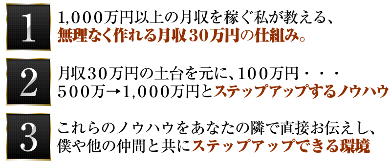 こういった点の判断基準や考え方、そして実際の方法論をお伝えして、ひとまずは月に100万円以上という規模を目指して頂くのが第2ステージとなります。