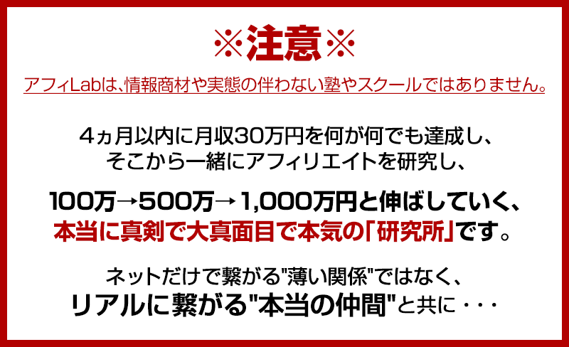 なので私とあなたも[先生と生徒」ではなく、同じくアフィリエイトを研究する「仲間」として共に成長していける環境作りこそ「アフィLab」なんですね。